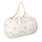 Travel bag with purple flowers. Strong and long shoulder strap Zipper with pon pon detail The bag has a lot of space and can contain multiple items The bag is great for travel Quality fabric One size; 33*33*50